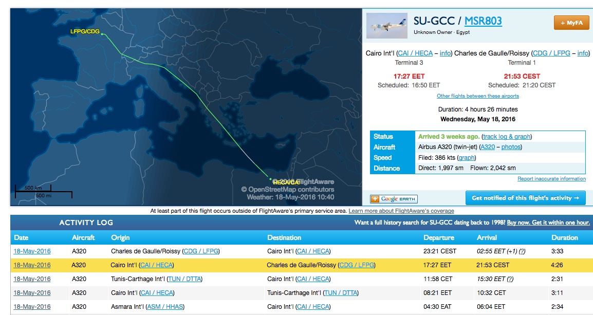 Source: http://www.wpsdlocal6.com/story/321...4-made-3-emergency-landings-before-it-crashedFrench media reports the plane made three emergency landings in the 24 hours before the crash. The plane was forced to turn around after taking off to return to airports in Eritrea, Cairo and Tunis. Each time, the airports allowed the plane to leave after inspectors finished technical audits and found nothing wrong.