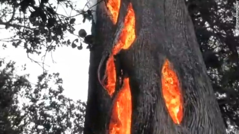 Aerial views show thousands of burnt trees along the fire's path.