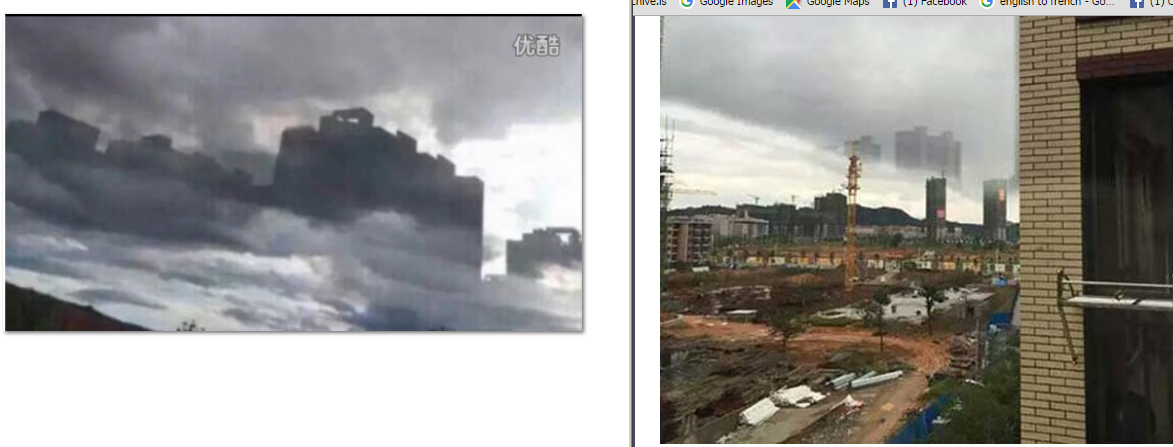 @Mick West So a friend brought this up to me coming across that video and these photos from some youtube video making the rounds again. I also noticed in the photo on the right, the yellowish building seems to have a line going up the length of it that connects to a cloud. I know you felt it was a reflection but do you think it may be photoshops or is a reflection more likely. Because the one on the left is definitely a reflective illusion but this one just looks fake.