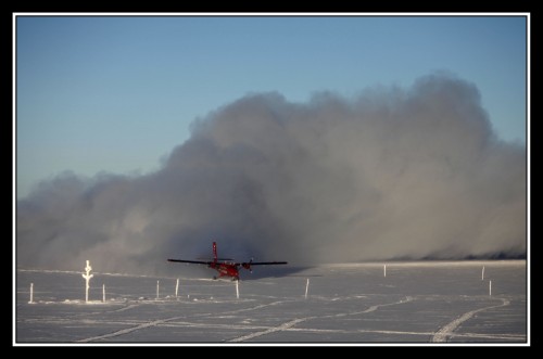 A tiny, ski-equipped Greenland Air twin otter slides in for a landing at Summit Station on Friday. The twin's exhaust hits extreme cold temperatures and creates ice fog, which lingered in the still air for some time. Photo: Ed Stockard