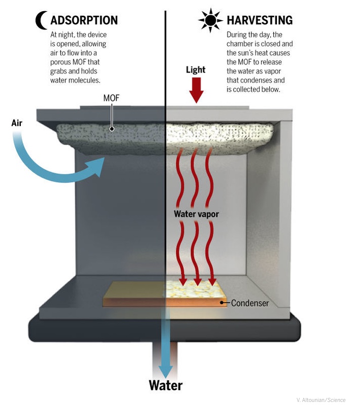 "The key to the new system lies in the porous material itself, which is part of a family of compounds known as metal-organic frameworks (MOFs). Invented by Yaghi two decades ago, these compounds form a kind of sponge-like configuration with large internal surface areas. By tuning the exact chemical composition of the MOF these surfaces can be made hydrophilic, or water-attracting. The team found that when this material is placed between a top surface that is painted black to absorb solar heat, and a lower surface that is kept at the same temperature as the outside air, water is released from the pores as vapor and is naturally driven by the temperature and concentration difference to drip down as liquid and collect on the cooler lower surface.