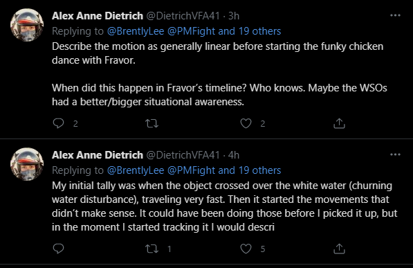 I think you've made valid points. I just wanted to add that Dietrich has stated her plane was banked so their field of view was presumably clear to facilitate having eyes physically on Fravor and his mysterious prey.