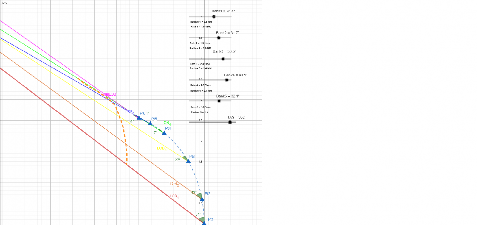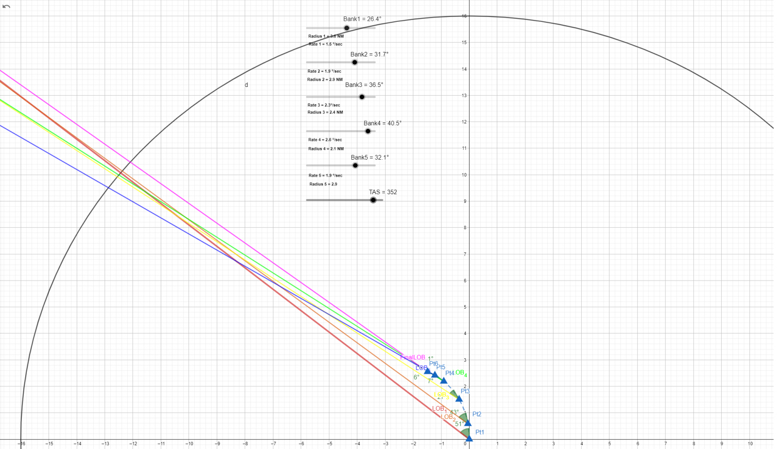 There is a corresponding line of bearing drawn at each point where the bank angle changes. The colors of the lines are in ROYGBV order from point 1 to point 6 respectively. As you can see the first 4 lines tend to converge and then the last two, blue and magenta, break from the pattern of convergence. The larger circle is drawn at 16NM and seems to be about where the lines start to diverge again.