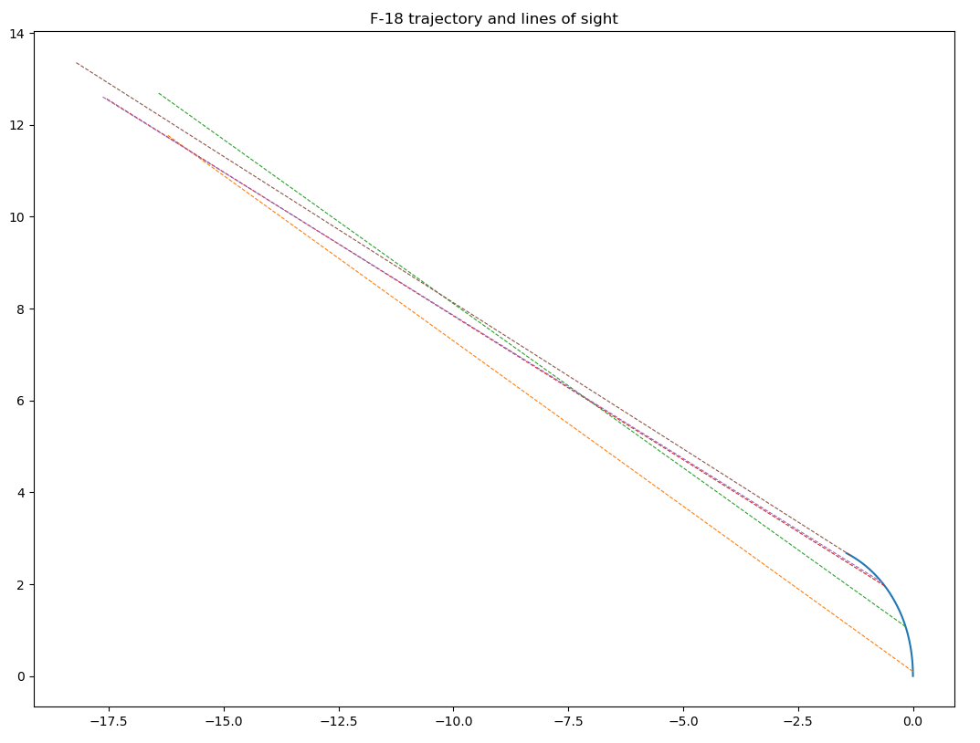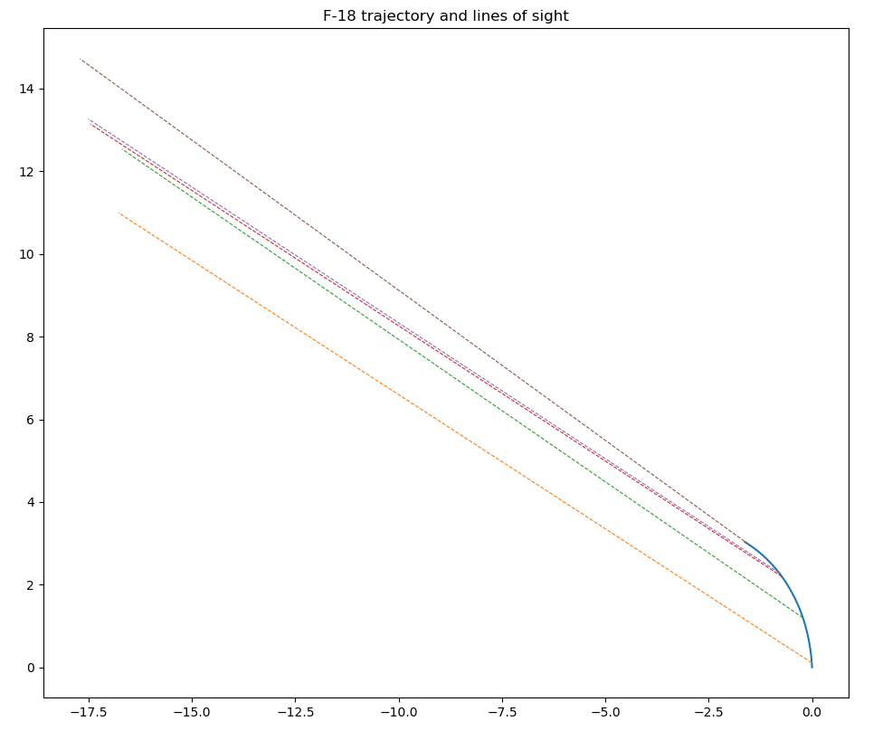 If we're being honest, that doesn't make much sense for a steadily moving target at _any_ distance. One possibility I considered is that there might've been some wind shear between the target and the F-18. Here's with a wind shear vector of (-20, 40) knots: