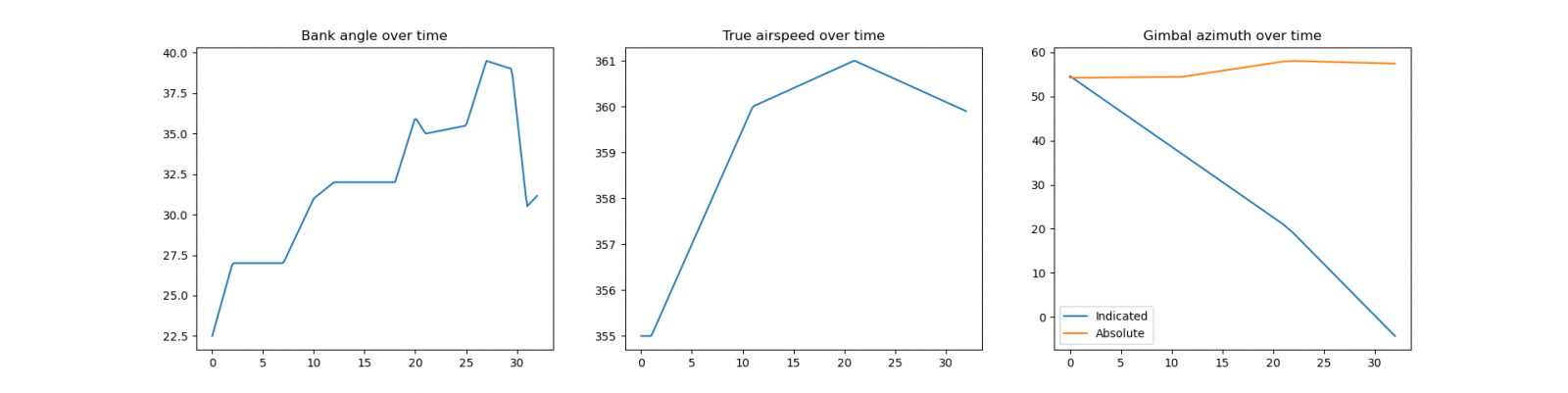 for the bank angles, and read a few gimbal azimuth values directly from the video. The values for all times are obtained from the few chosen values by interpolation (I tried linear and cubic, didn't seem to make much of a difference). Still, improving that data would probably improve the analysis.