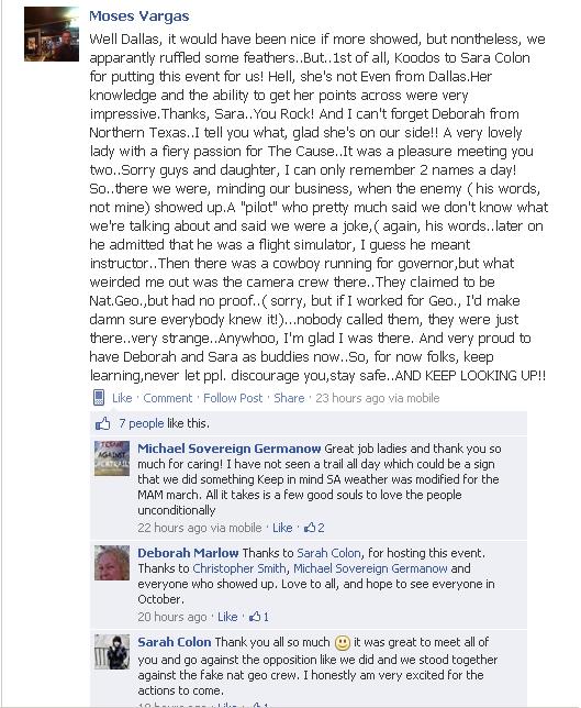 This group was very entrenched as one would expect and they were all indoctrinated to the aluminum climate manipulation theory but the one rude one was very stuck on her symptoms from the spray. I showed her some charts that had lots of intersections on them as well as my medical and license. The rude one couldn't explain why I was so healthy but claimed it was my age.