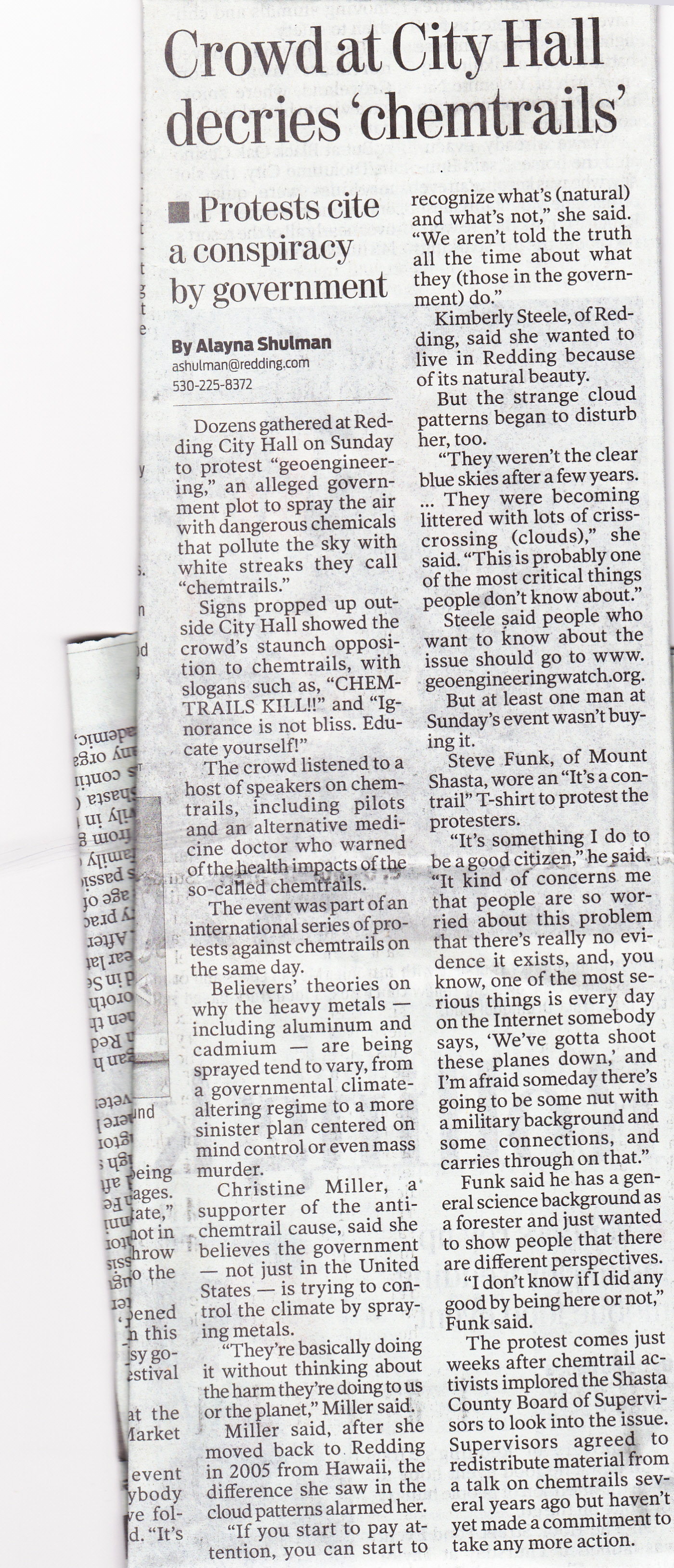 The protest comes just weeks after chemtrail activists implored the Shasta County Board of Supervisors to look into the issue. Supervisors agreed to redistribute material worn a talk on chemtrails several years ago but haven't yet made a commitment to take any more action.