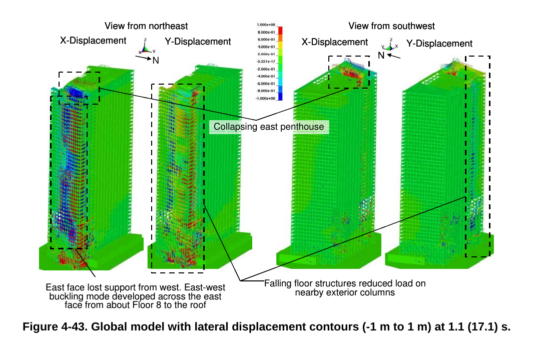 And the NIST simulation does not suggest substantial floor collapse beyond the east. Rather it suggests a sideways sliding of largely intact floor structures which caused the storeys to fold along the north-south axis like a square truss. So columns bent in sync with those to the south and north. Hence caption "Northward shifting of structure spreads to buckling of exterior columns"