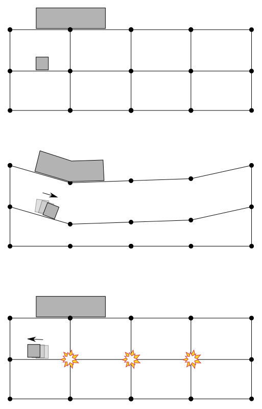 Of interest here is the somewhat isolated buckling of the far west columns, which buckle about 0.5 seconds before the more central columns. This is probably related to the impact damage and the way it changed the load redistribution.