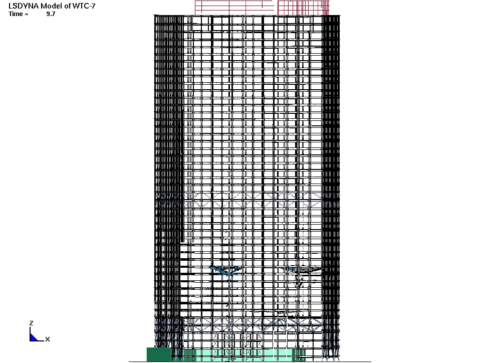 This can also be seen in the south view, where the floors on the West side (to the left here) are seen to be falling as the interior columns buckle before the exterior buckling. You can see this by the blue colored floor slabs.