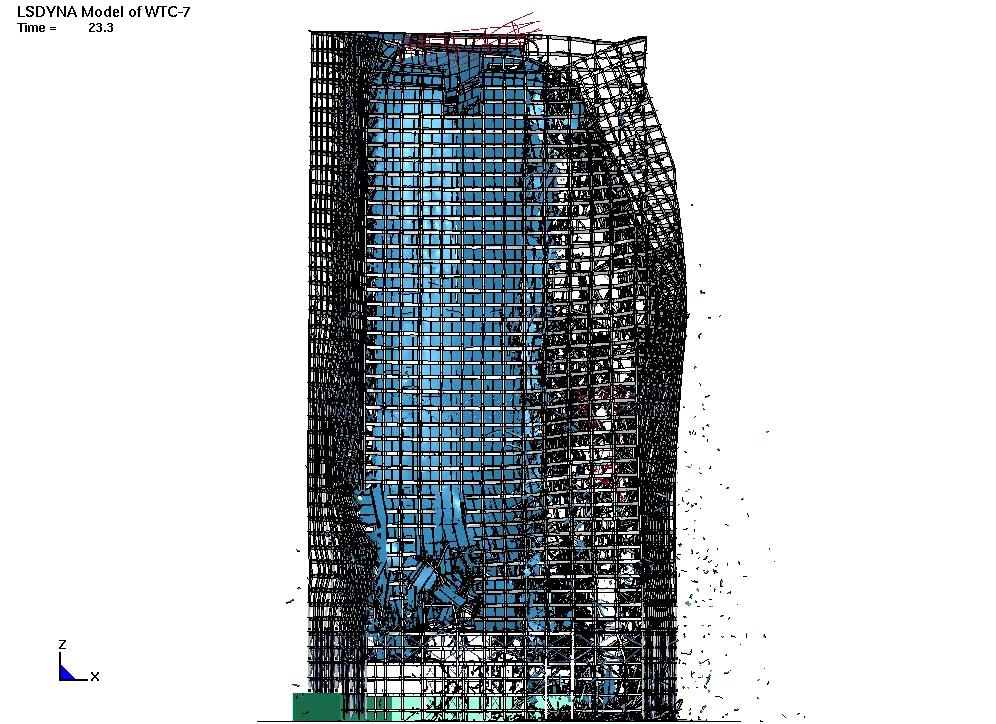 It's not at the same angle as the other visualization, so you can't do a perfect overlay. But roughly here you can see at time 22.1 the interior columns have all buckled, hence the interior on the right hand side (West) is falling with the building.