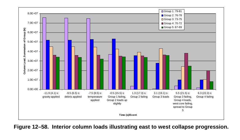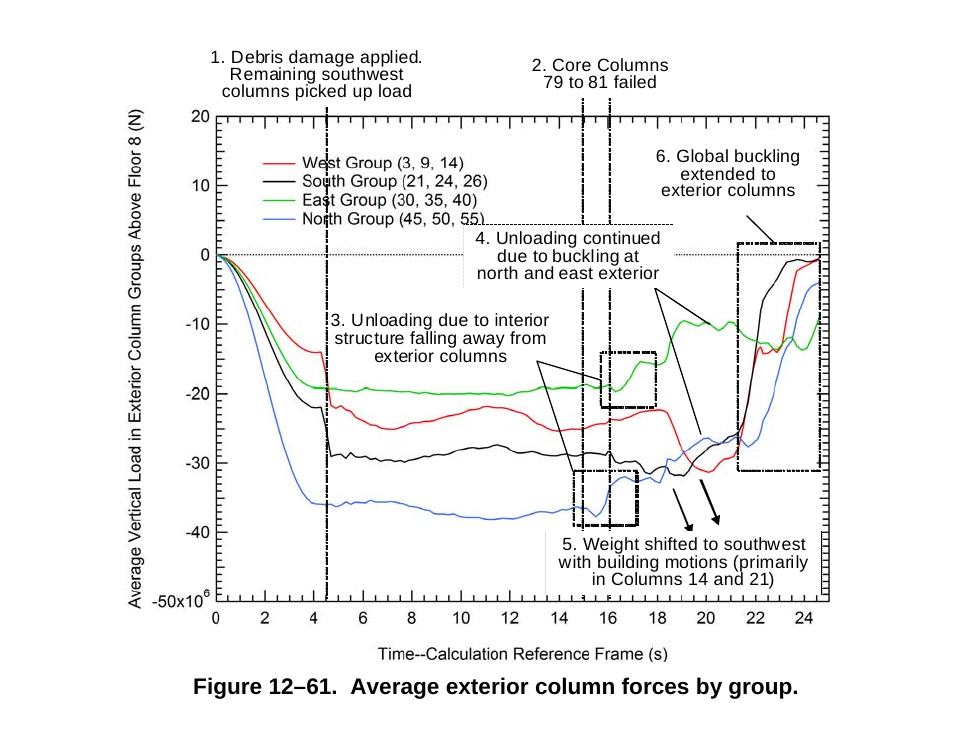 Corresponding loads for the column groups 1 to 5 during the horizontal progression of buckling are shown in Figure 12–58. Column group 1 (Columns 79, 80, and 81) failed at -0.5 s before the kink was observed in the east penthouse, and column groups 1 to 5 had failed by 6.3 s.