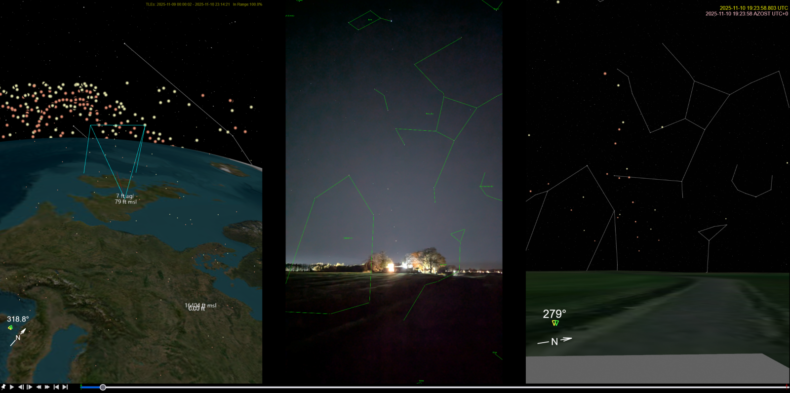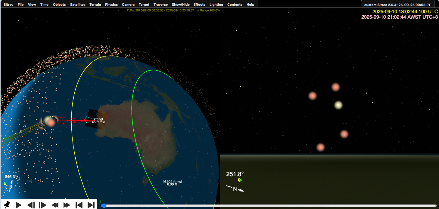 A few of the people I was with were very used to seeing satellites going overhead and recognized that these seemed to move pretty fast and didn't behave like what they were used to, so it felt nice to have an explanation handy. I took some video, but I'm not sure if I'm seeing enough detail in it to exactly match the location and time of the video with sitrec, but getting in the ballpark area and time (Cooma NSW, between 2100-2200 AEST) matches what I saw to be essentially certain.