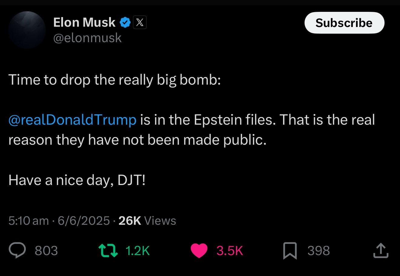 Bannon responded: https://www.npr.org/2025/06/06/nx-s1-5424732/trump-musk-feud-steve-bannon