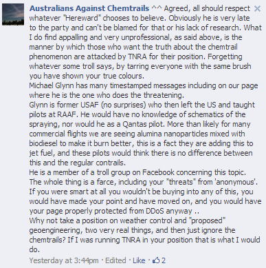 Giselle, no-one is demonising you. I am a pilot. I haven't signed anything. The only lies I have been told are industrial... but that's another story. Can I ask you how you believe the delivery of chemtrails works? Can you also see from the screenshots I have posted that there is a legitimate concern about violence from some people?