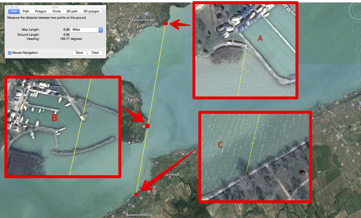 Still not sure why, though. Take these three points on Lake Balaton, for example: