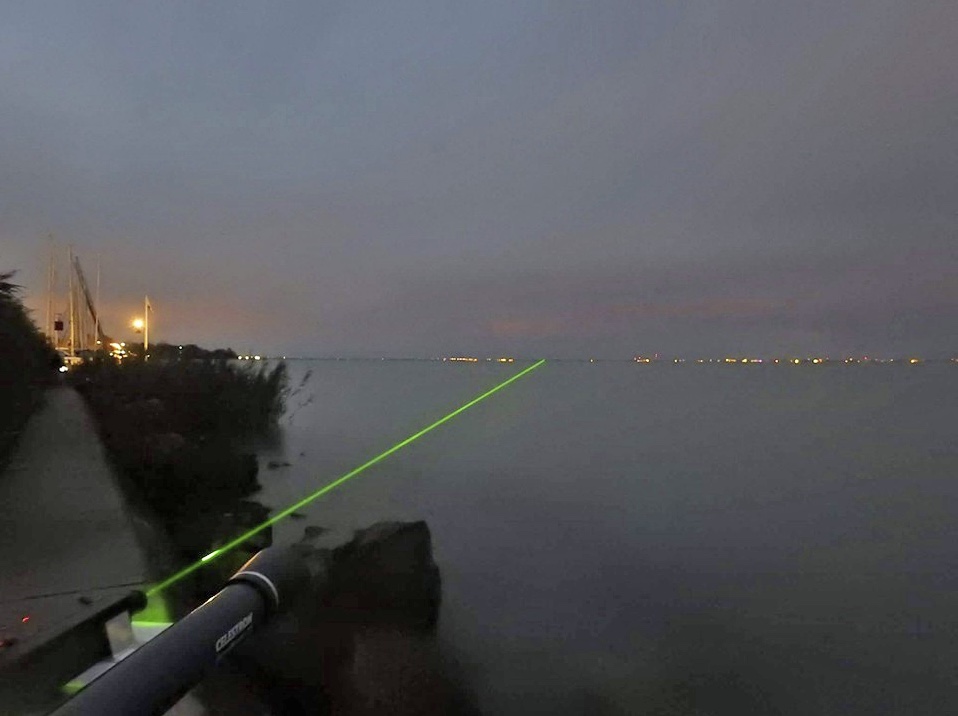 This image claims to show the laser beam bending upwards in the distance. This could occur with warm water and cold air, the same as in inferior mirage.