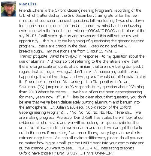 Friends.... many of you know that we are approaching a crunch point as more and more people are waking up to the likely reality, that there really may well be something going on untoward in our atmosphere. Recently I talked with professor David Keith during my questions, solely on SRM concerning alumina, he began to answer and oddly he switched to chemtrails,