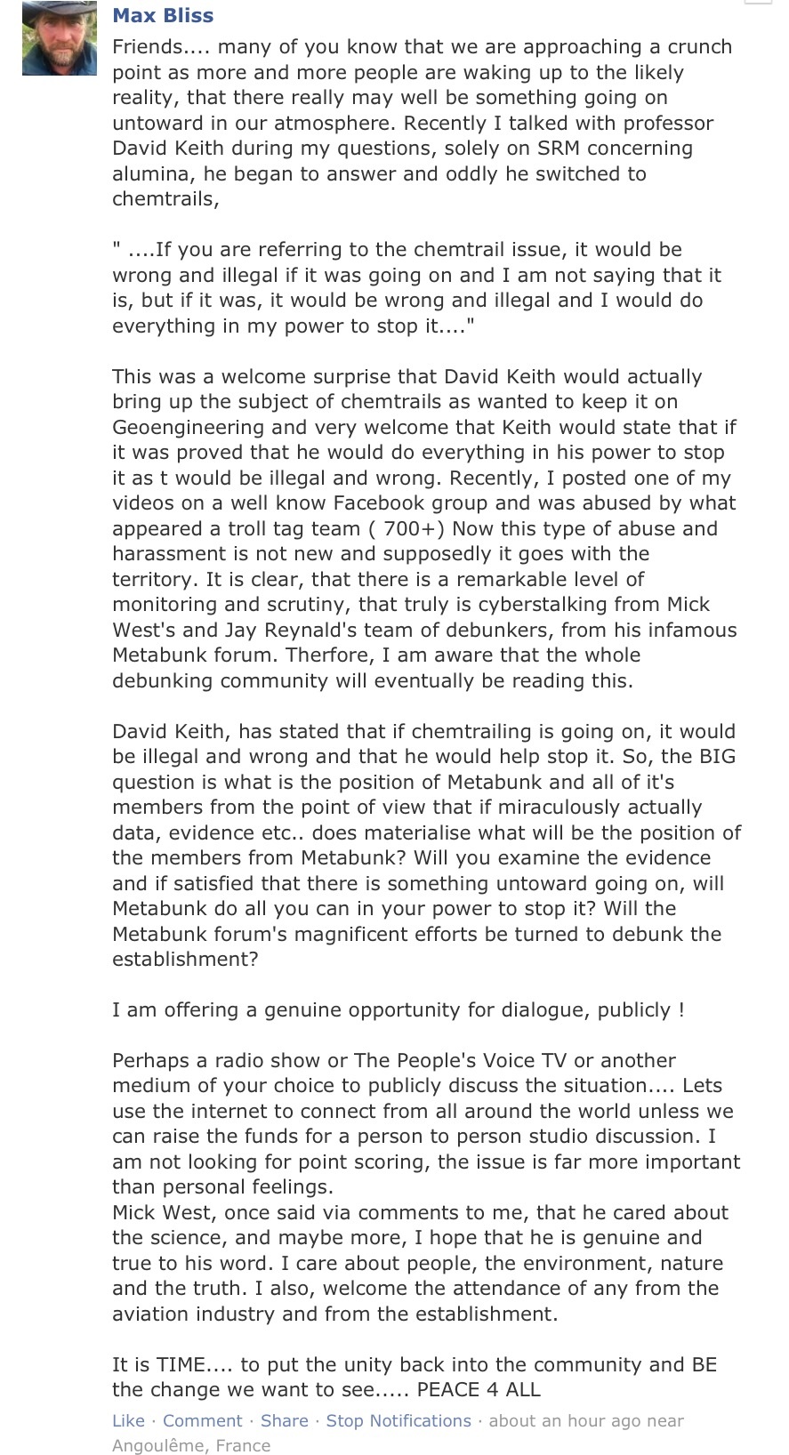 This was a welcome surprise that David Keith would actually bring up the subject of chemtrails as I wanted to keep it on Geoengineering and very welcome that Keith would state that if it was proved that he would do everything in his power to stop it as t would be illegal and wrong. Recently, I posted one of my videos on a well know Facebook group and was abused by what appeared a troll tag team ( 700+comments) Now this type of abuse and harassment is not new and supposedly it goes with the territory. It is clear, that there is a remarkable level of monitoring and scrutiny, that truly is cyberstalking from Mick West's and Jay Reynald's team of debunkers, from his infamous Metabunk forum. Therfore, I am aware that the whole debunking community will eventually be reading this.