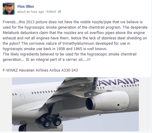 If "Max Bliss" is reading this...PLEASE, by all means, provide some actual "evidence" for "chem"trails! Not just videos, shot with your camera, from the ground (your backyard?).