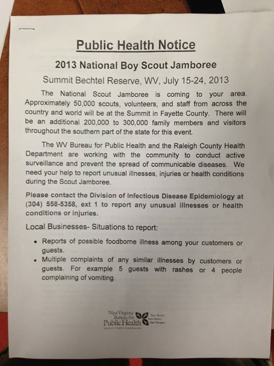 This arguably unusual notice from the Division for Infectious Disease Epidemiology within West Virginia Bureau for Public Health, recently circulated to shops and public spaces in Beckley, West Virginia, and nearby areas, when combined with the heavy military presence and medical health based rumours surrounding the event, is compounding a sense of concern among many residents.