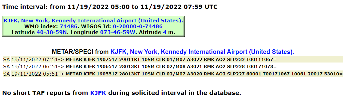 We also see a westerly wind all night (e.g. 27014KT meaning 270⁰, 14 knots), which means e.g. transatlantic flights would take off westward into the wind, ascend and turn around to then fly up the New England coast. (See for example the flight track on the previous page.)