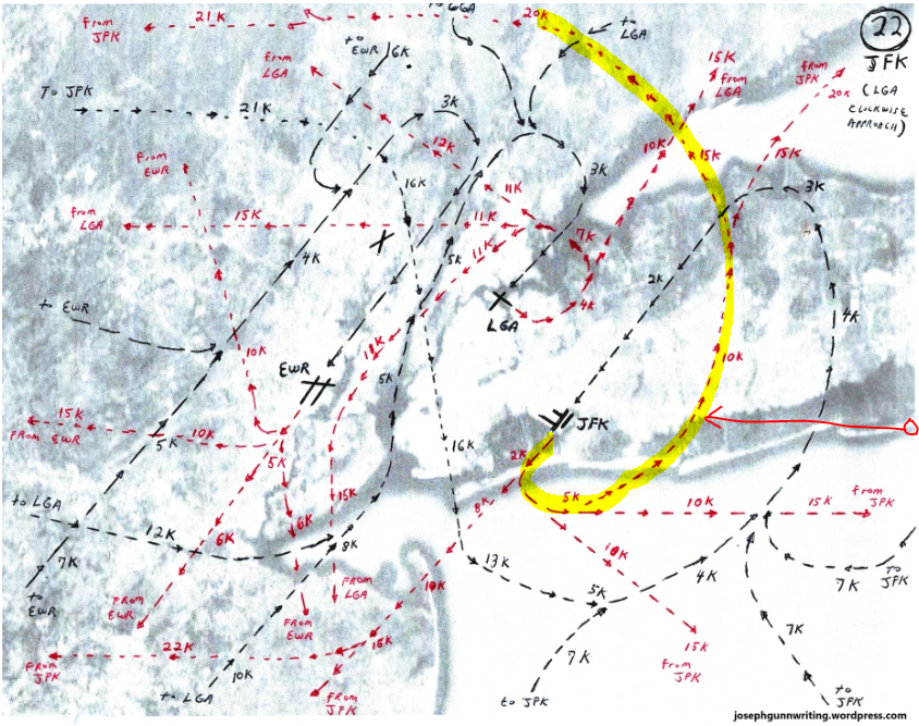 That means an aircraft departing JFK westward would first turn south and then cross right between the airport and Tedesco's "Nightcrawler" as it headed for DEER PARK.