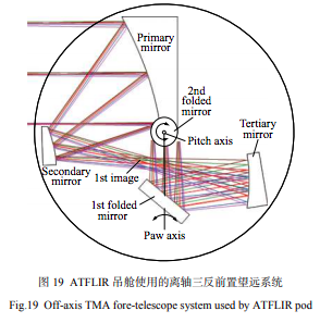 I was googling for the optical design of the ATFLIR, and of course not easy to find. But, I found this Chinese article where the authors go over a number of advanced optical systems. It is in Chinese, but luckily sometimes English terms and acronyms are used. The image below is from this source and shows the sideview of the gimbal mounted telescope. It is a TMA (three mirror anastigmat), which is a very neat compact design but not often used as it requires conic surfaces which are not easy to make.