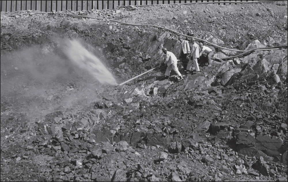 This April 29, 1963, photograph shows a crew washing and cleaning the dam site's core block area, which had to be cleaned down to the bedrock prior to any concrete pouring. The amount of concrete poured into the core block was 231,000 cubic yards. The core block acted as a toe for the embankment that would be placed during the 1964 season. (Courtesy of CDWR.)