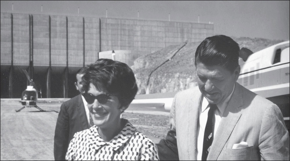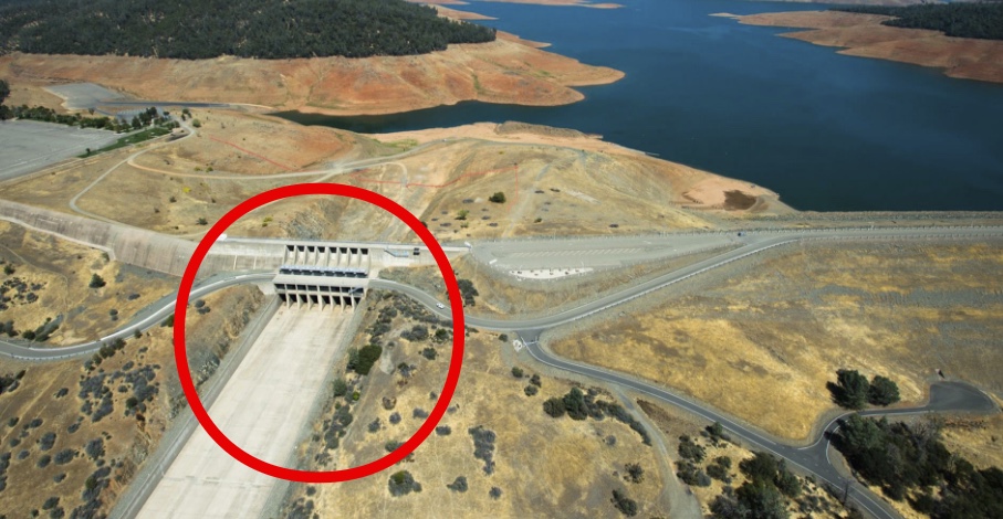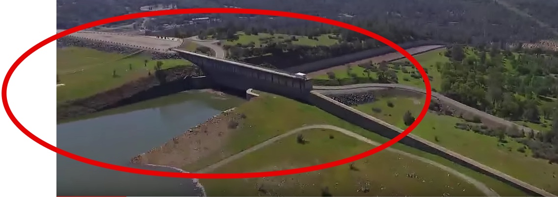 When Reagan arrived for the inauguration of the dam in 1968 they landed the helicopters on the intake areas of the man spillway. The rocks behind him are part of the ridge that separates the main spillway from the e-spillway and should prevent any procession of damage in the event of the e-spillway failing.