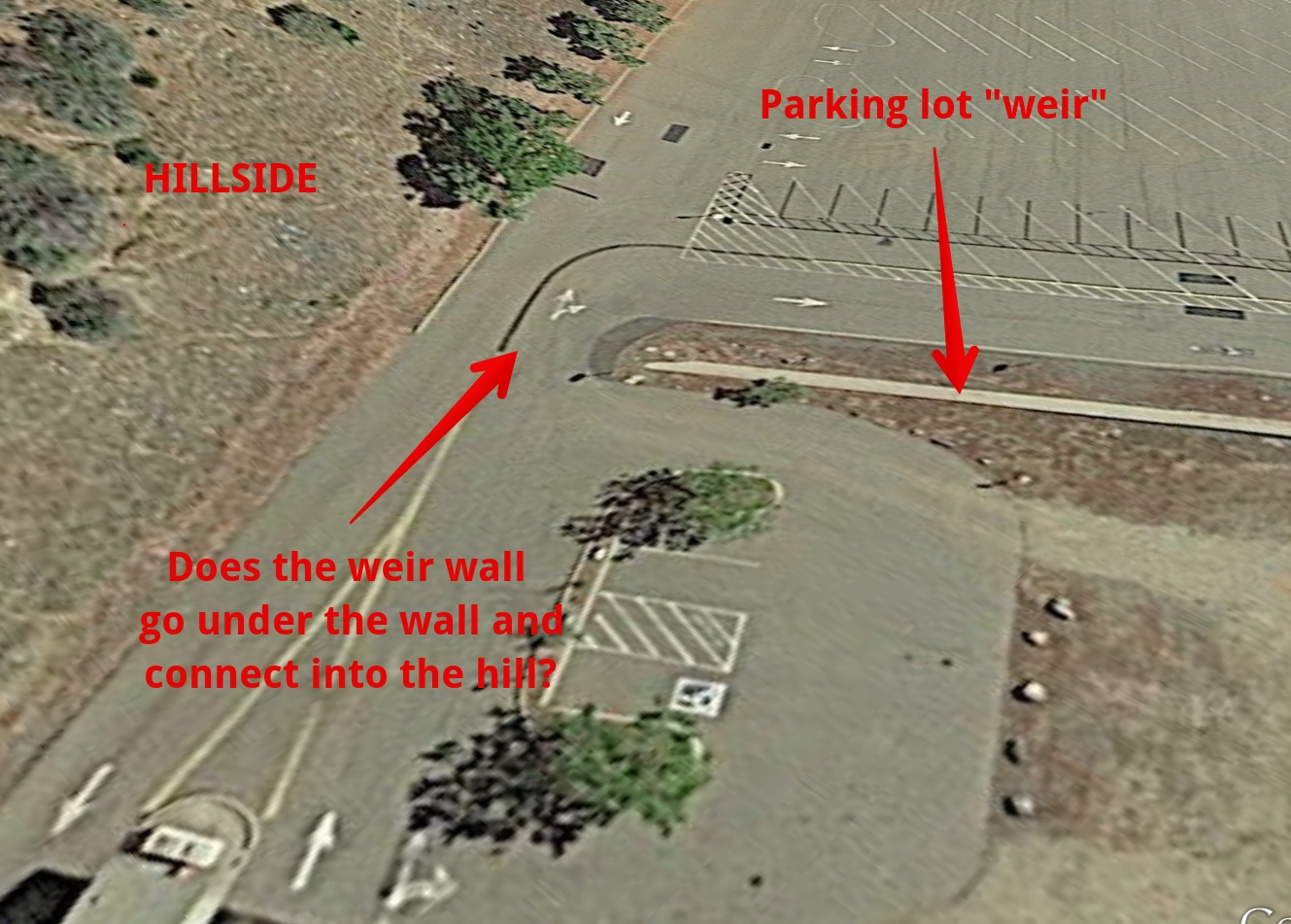 That weir should be extended and until it reaches higher ground at back side of parking lot or it is both largely worthless and a significant failure point.