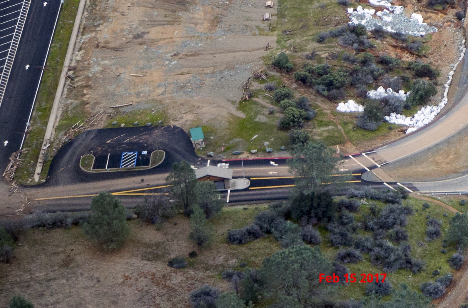 Haven't had time to look at topography or geo map at this point (first image, road bend, post #506) What I see here are stress cracks , water stains still visible suggest very wet underneath, likely cause. The giant ogee weir is almost certainly a very robust structure IF foundation holds. The smaller longer rectangular is an area of concern. Clearly not expected to handle same flows as Ogee, hence less robust. Key issue here is elevation. Higher elevation is your friend, lacking that a problem area could be isolated with sandbags forming a diversion wall and pumping on the problem side of the sandbag diversion. Not pretty, but quick and, at least it lowers local hydraulic head and reservoir supply.