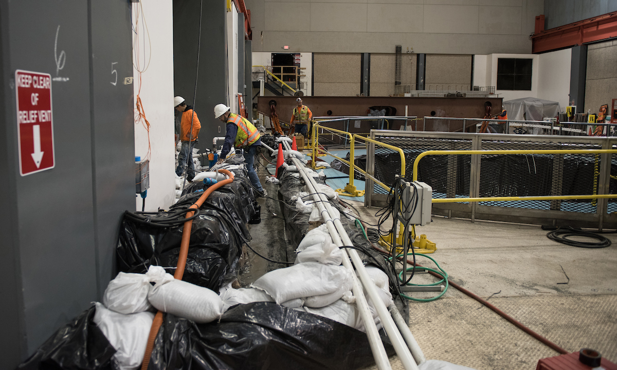 California Department of Water Resources placed sandbags along a inside wall at the Edward Hyatt powerplant to manage possible water seeping due to the debris backup in the diversion pool from the damage Oroville Dam spillway. The powerplant is located underground at the left abutment near the axis of Oroville Dam in Butte County. Photo taken February 16, 2017.