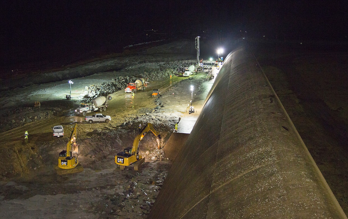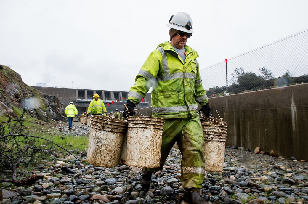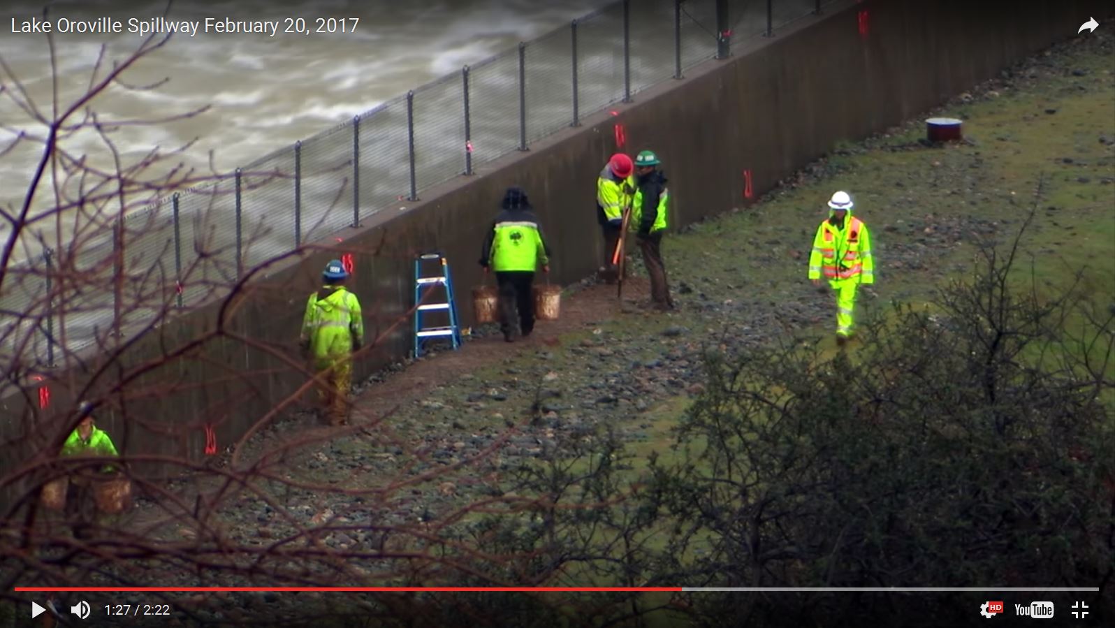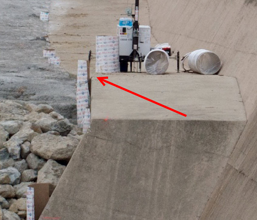 Here is an annotated version of the picture you posted showing the workers on the spillway (from