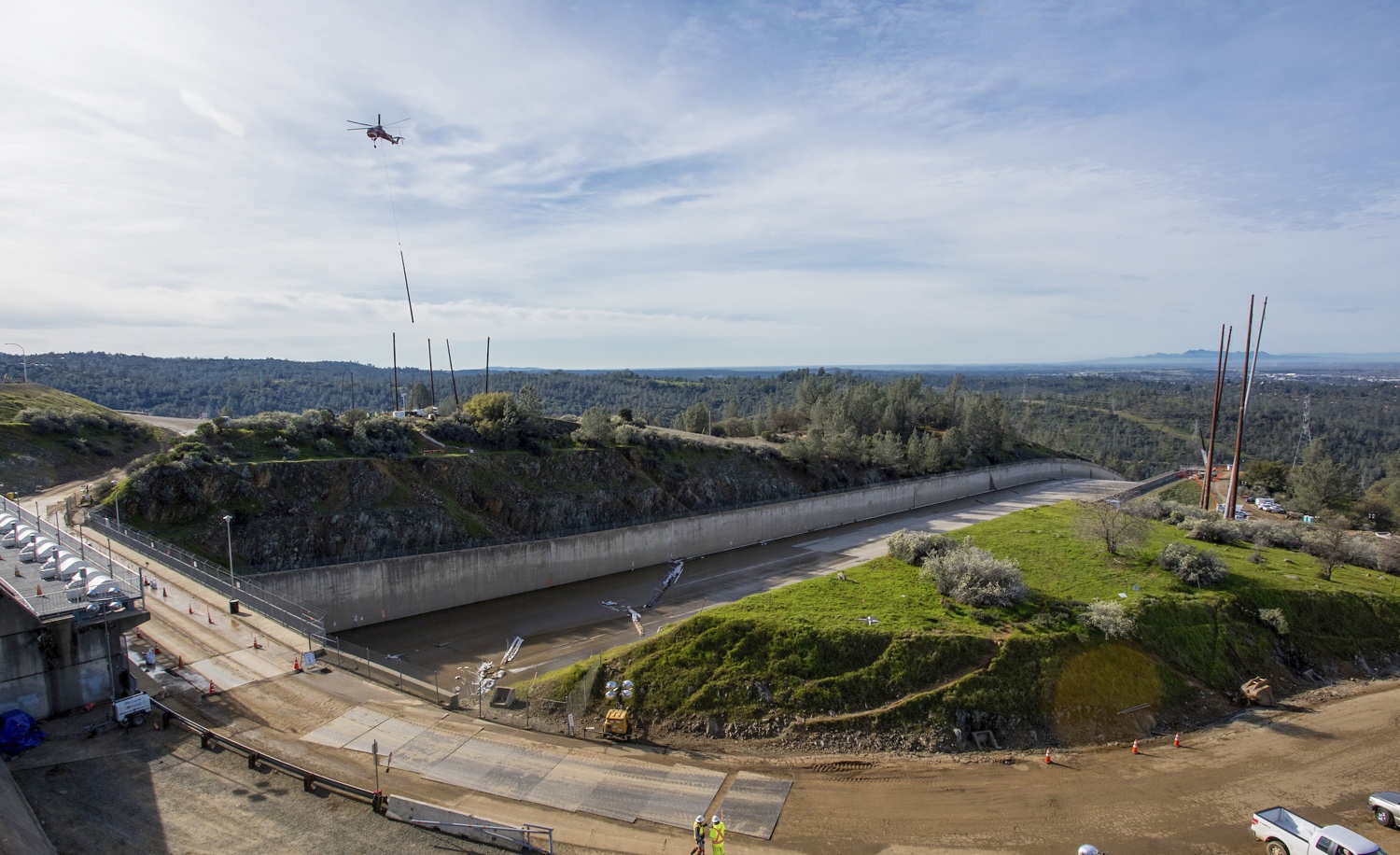 A sky crane flies over the Lake Oroville Dam flood control spillway while delivering a power pole that will be used to construct a temporary utility circuit called a shoo-fly. Photo taken on March 11, 2017.
