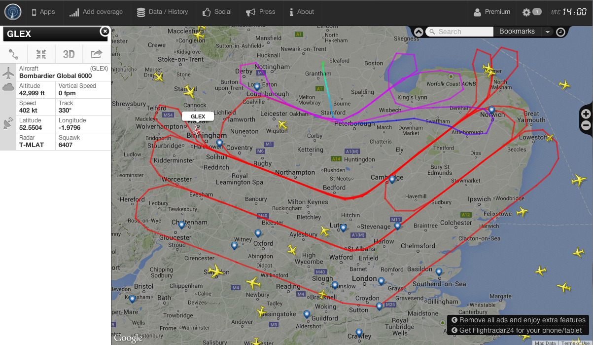 This Bombardier Global 6000 has been flying around for hours passing several times right above my place. I thought first that it was a RAF Sentinel R1, but no radar pod could be seen in close up photos. Nevertheless, its flying path looks rather special.