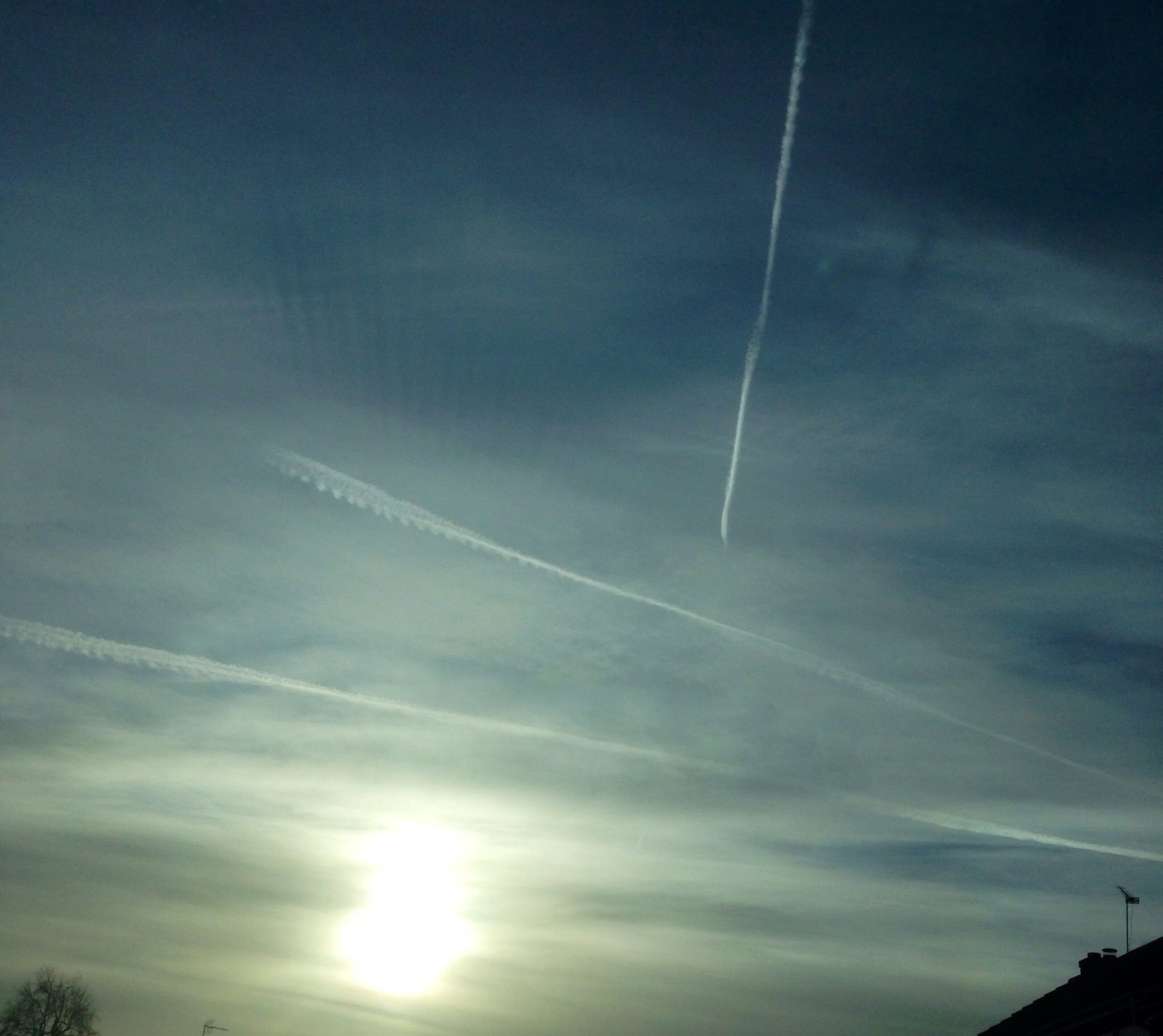 Contrail with pendules(?) casting "Venetian blind" shadows. Apologies for the 'phone camerawork.