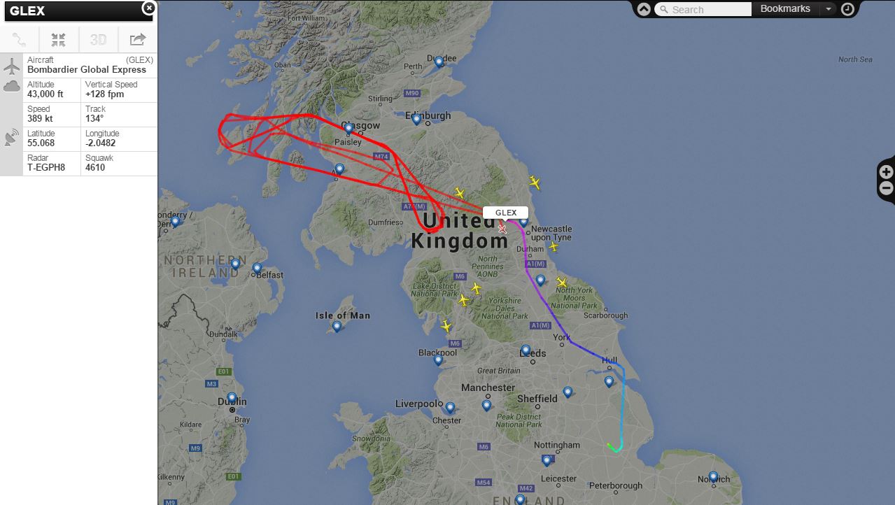 The Bombardier Global Express, flight number GLEX, was tracked flying all over the southern half of Scotland on Tuesday afternoon, jetting as far west as Jura before looping back to circle over Ayrshire before passing over Glasgow and heading south to Dumfries and Galloway at an altitude of 40-43,000ft.