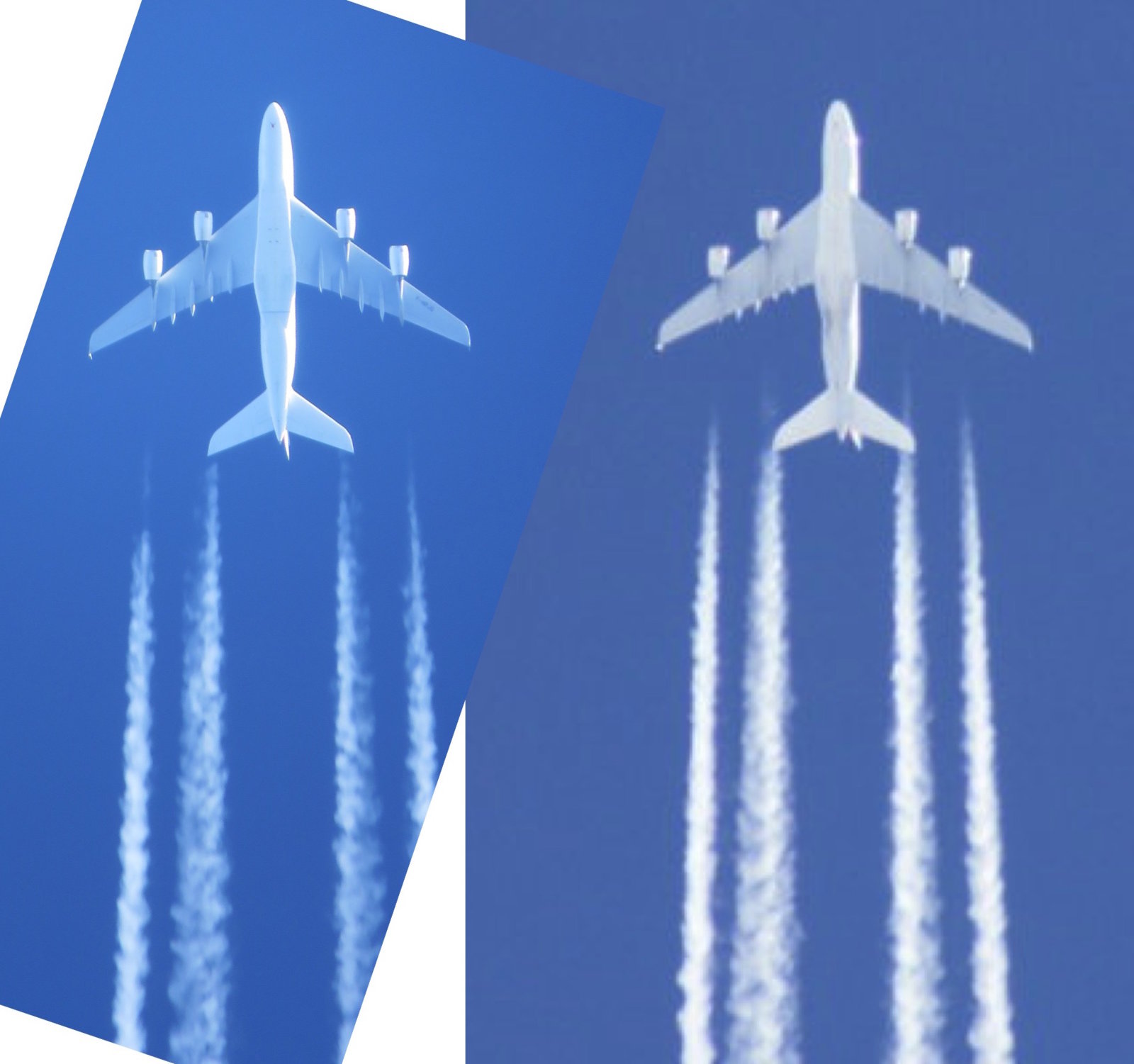 For direct comparison, I've scaled and rotated my A380 photo. Together with the cloudspotter's photo it makes a pseudo stereo pair: