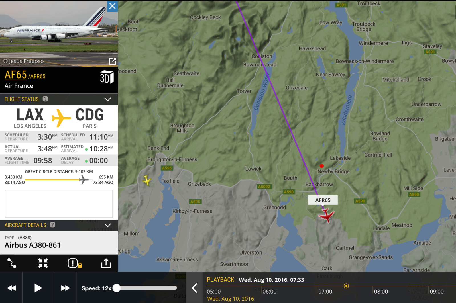 I have taken a photo of Air France A380 this morning flying nearly overhead and it looks almost exactly like your photo of "unmarked white plane". It was just south of the lake Windermere. I'll post it later when I am back from our vacation there.That may be it, I'll check the times. Did the A380 make a turn to port just before this?
