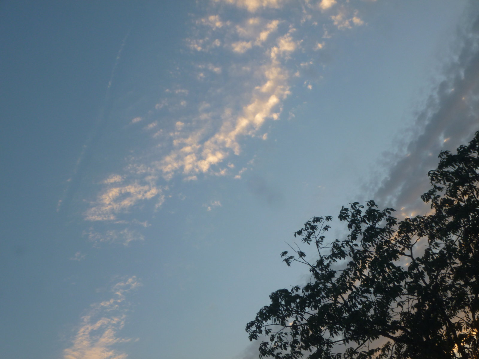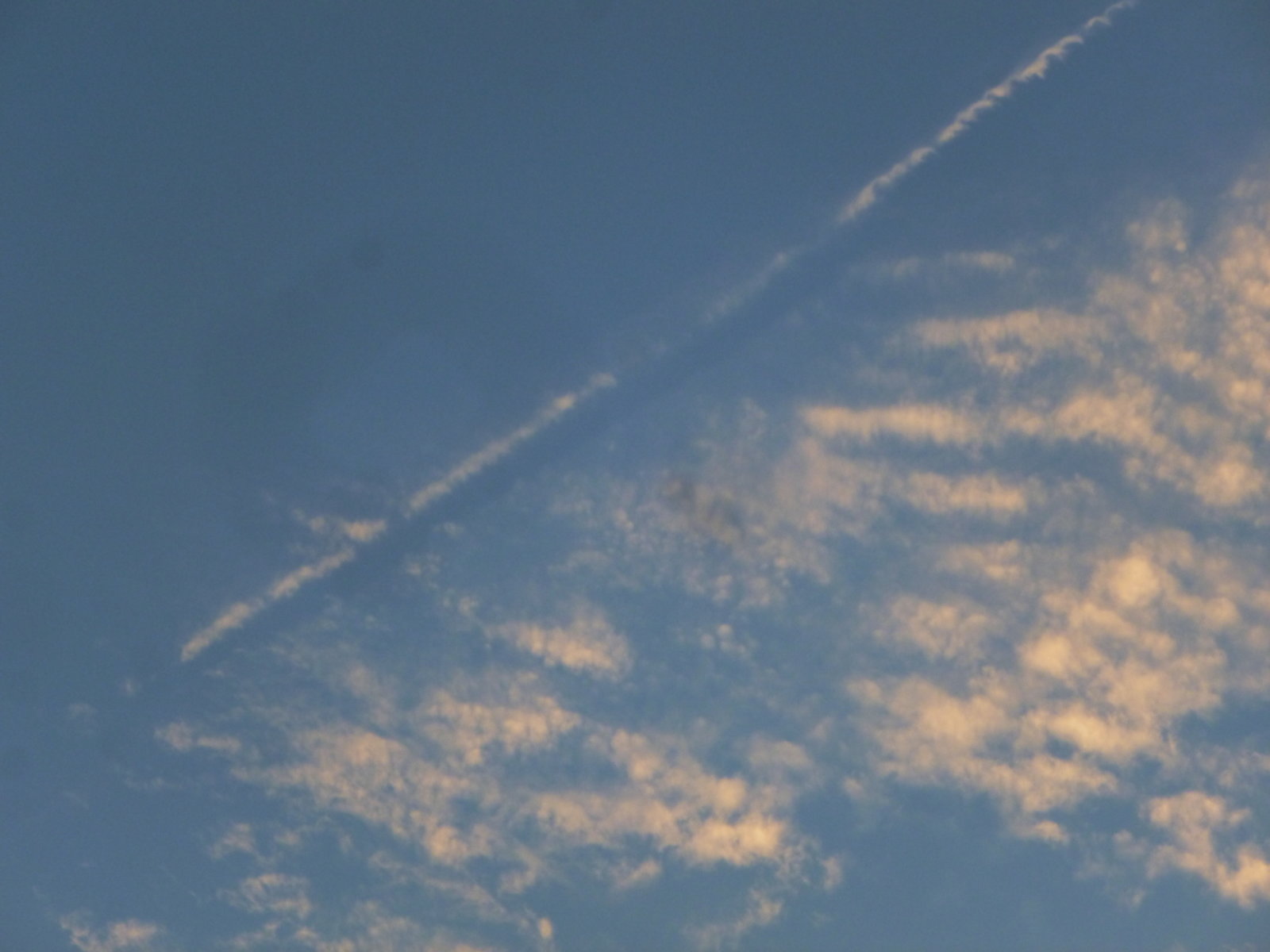 One plane with a contrail and one with none at all this evening. (You might need to open the full-size pic to see the other plane: its almost exactly level with the one with the contrail, and one third of the width of the photo to the right.)