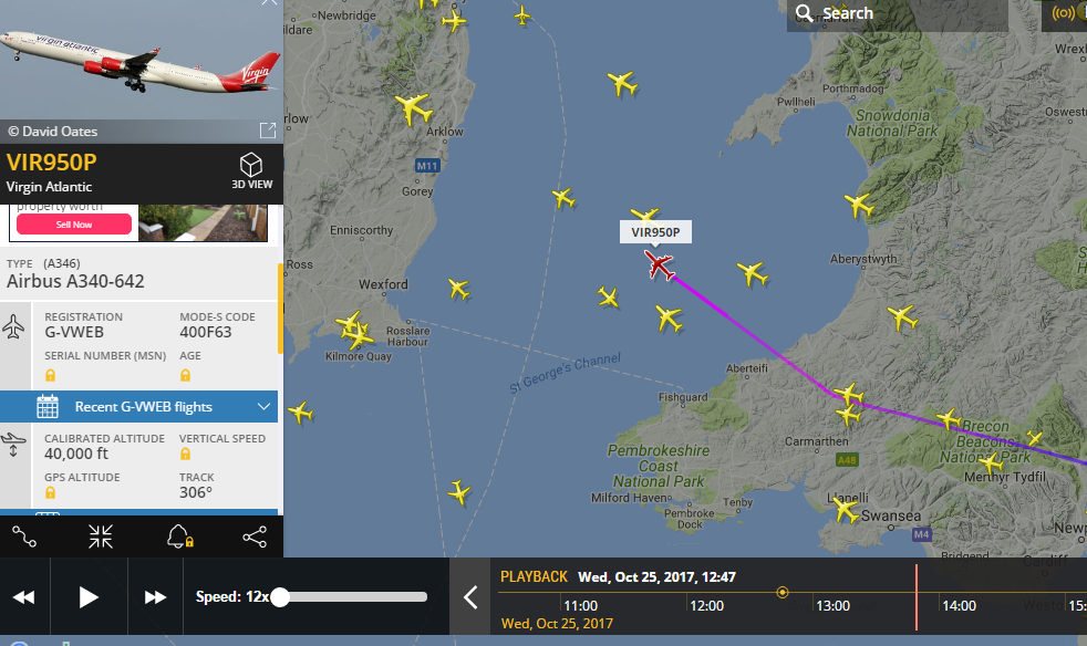 The photo was taken from the red dot in Farnborough, looking just south of west (the front of the house faces pretty well due east). The two persistent trails are BY1360 and DY4275, at 35,000ft and 34,000ft respectively, and the non-persistent one is DL411, at 37,000ft.