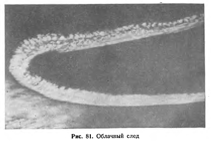 Artificial cirrus clouds which form behind airplanes in upper troposphere and lower stratosphere; their structure is similar to Cirrocumulus clouds; the international name: Cirrus tractus (Ci tr.). They are often observed in conditions favourable for cirrus clouds formation; and cirrus usually cover a part of the sky (even a small one). The formation of airplane trails is generally caused by water vapour in the exhaust (condensation trails); another reason is dynamic pressure decrease in vortices running off from wings and propellers and adiabatic temperature drop (aerodynamic trails).