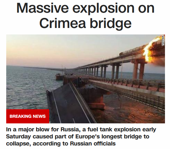It's a long shot, but as Russia has used the bridge incident as a pretext for another massive bombardment of Ukrainian cities, we should at least consider the possibility that it was a Russian false flag operation. This may seem unlikely, not only because it has damaged an important military supply route, but because it is personally humiliating to Putin. (Also very embarrassing for those who are responsible for security on the bridge.) But it is reported that there are factional divisions within the Russian military and security regime, and there are some elements who would actively want to promote a nuclear strike on Ukraine. It would be much easier for Russian operatives (maybe from some branch of the FSB, or the Chechen militia) to organise a truck bomb from the Russian side of the bridge than it would for the Ukrainians, no matter how clever they are. Putin himself would not necessarily have been involved.