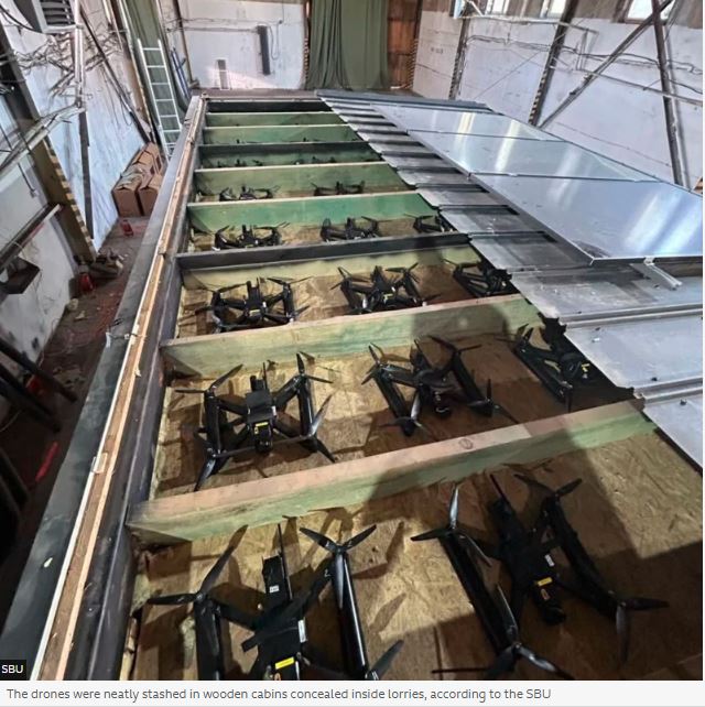 Maliuk [Vasyl Maliuk, head of Ukraine Security Service, SBU] said the drones were smuggled into Russia inside wooden cabins mounted on the back of lorries and concealed below remotely operated detachable roofs.