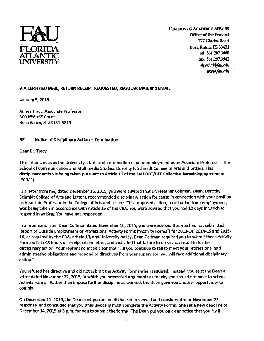 I may have said it before, but there is always some confusion between academic freedom, free speech, and responsible speech. That last quality is an important part of the debate, beyond the collective bargaining agreement (which Tracy violated) or due process concerns.External Quote:"There's still a lot that most of us don't know," said Peter Bonilla of the Foundation for Individual Rights in Education. "I would hope that it not be the case that this investigation and their termination proceedings are motivated by hostility to his views — which are obviously quite in the minority and quite unpopular. I can only hope that they give him the same process that it would give any other faculty member who is accused of the same violations that Professor Tracy is.