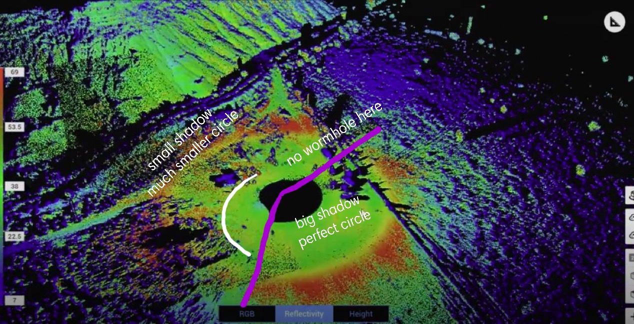 The mysterious part to me is why there is a green circle of lower 'reflectivity' underneath the drone, surrounding the black hole of no data. I don't think it is an albedo effect, which might be caused by the local geometry of the ground cover - it looks too even for that. I now think it is connected with the optics of the drone LiDAR system itself.