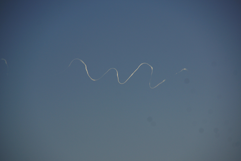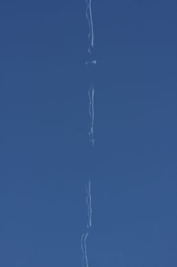 Quite a few, showing the four trails evolving into one. . However.. it evaporated without making a big squiggle. Good evidence for something that did not really happen, but might have! I went back up the trail towards the plane, and then back down to the end, in sequence (by file name).Probably it was a right one, as the contrail came from a heavy plane (Boeing 747). Actually, it looks similar to the 747 trail I reported in the sister thread:
