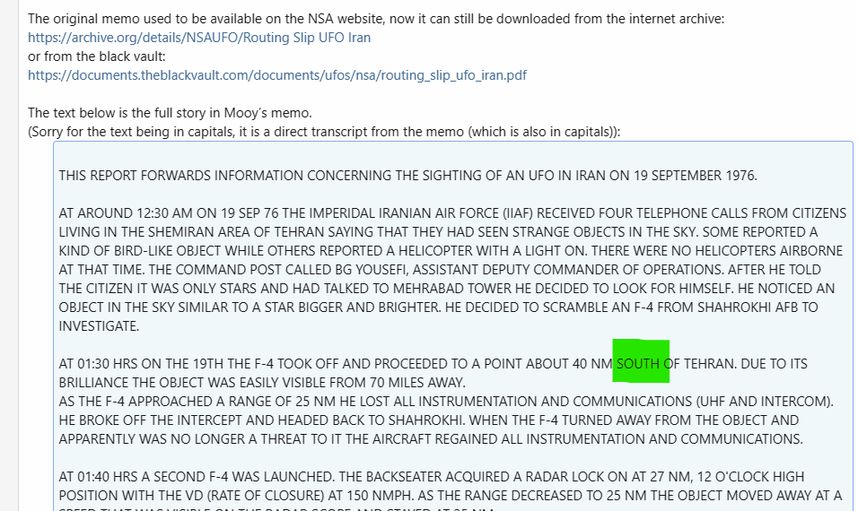 Jets are vectored to a point 40 nm north of Tehran (source: Mooy's memo).