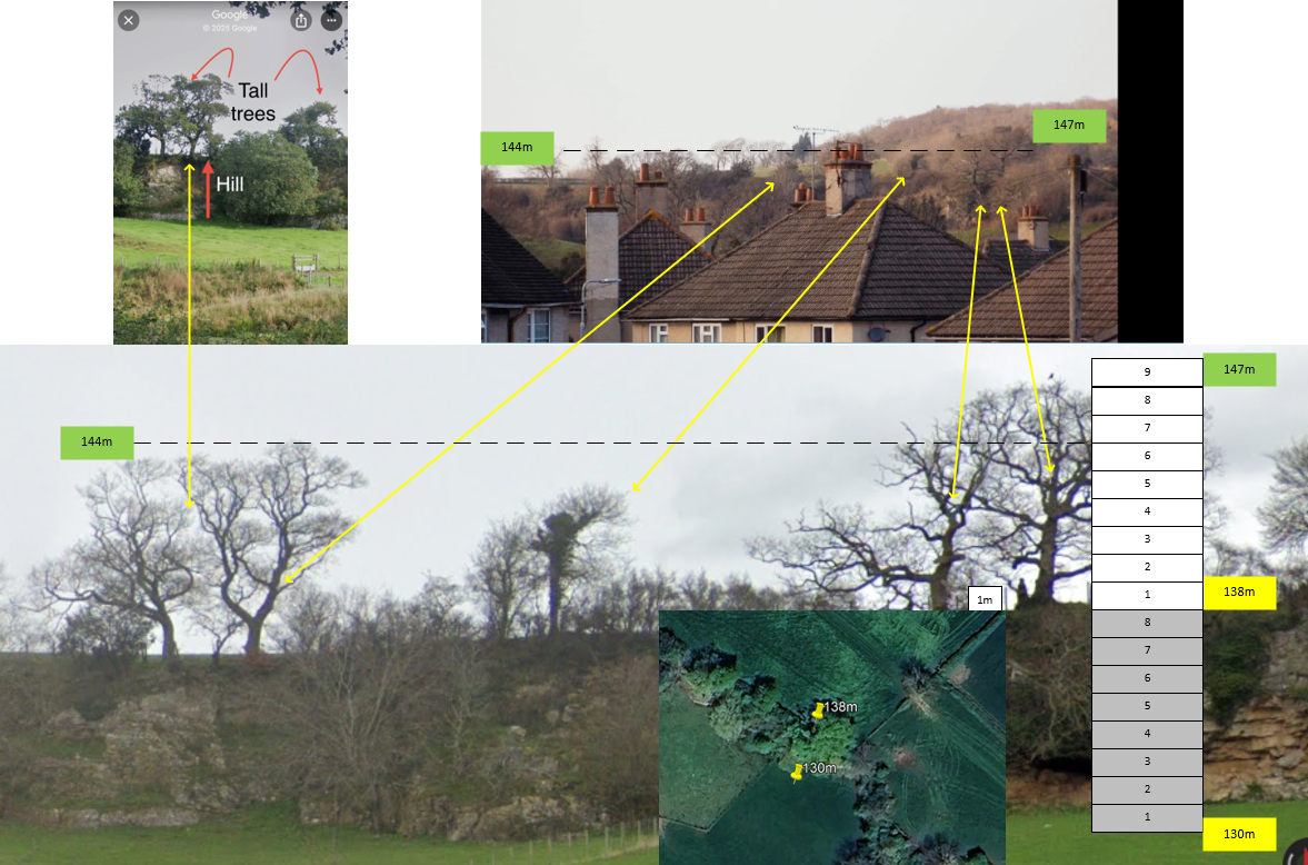 - The ridge behind Coppi Farm is not a flat 129–140 m ground → it's ~10 m of trees on top